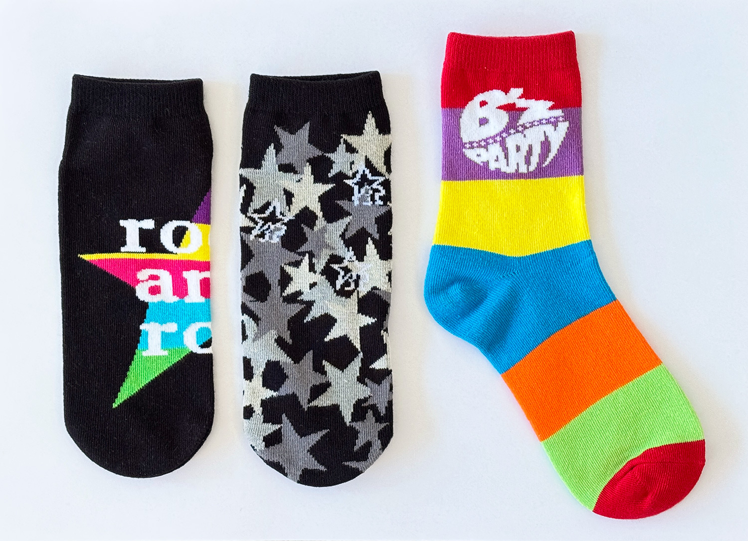 ビビッドなrock and rollロゴとB’z PARTYロゴを組み合わせた「R&Rソックス」、レインボーカラーが目を惹く「Rainbowソックス」、カラーは控えつつ、少しだけB’z PARTYロゴをあしらった「Monotoneソックス」の3種類をご用意!